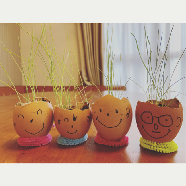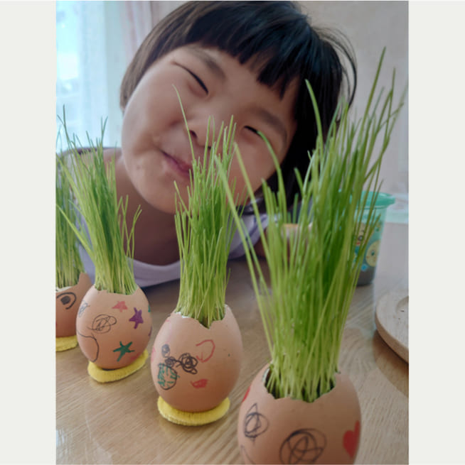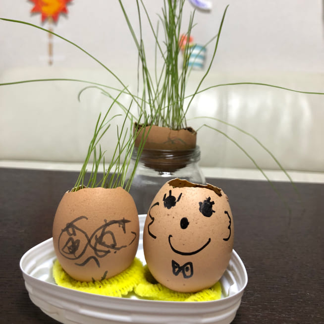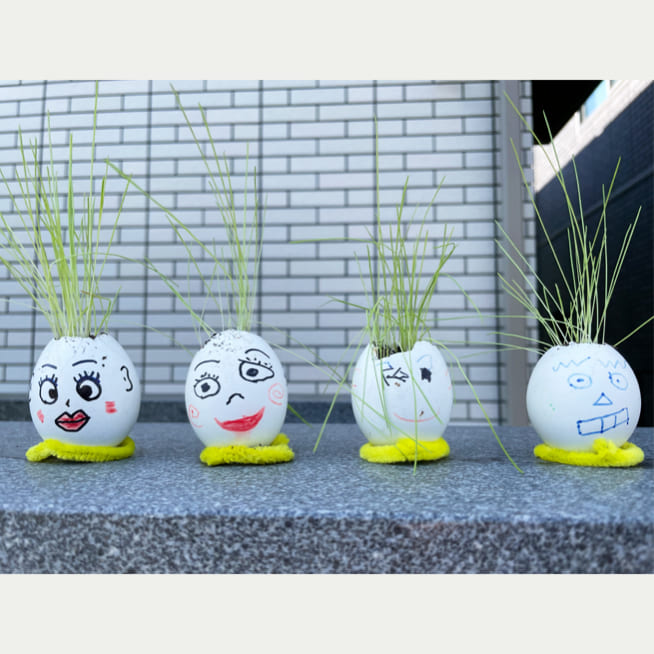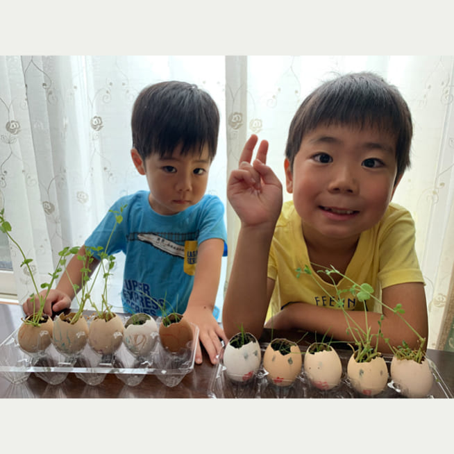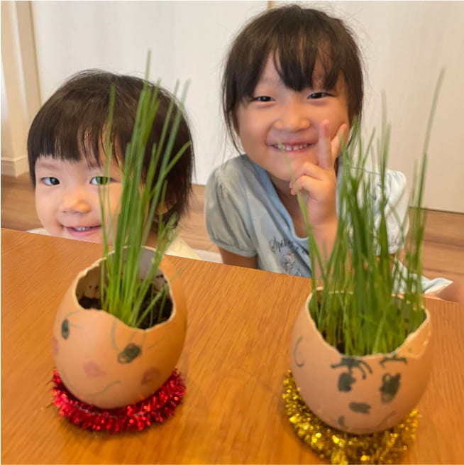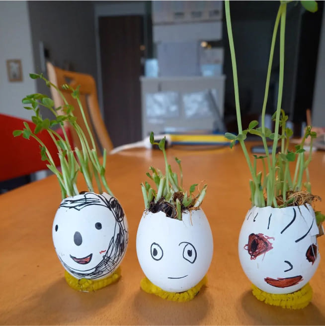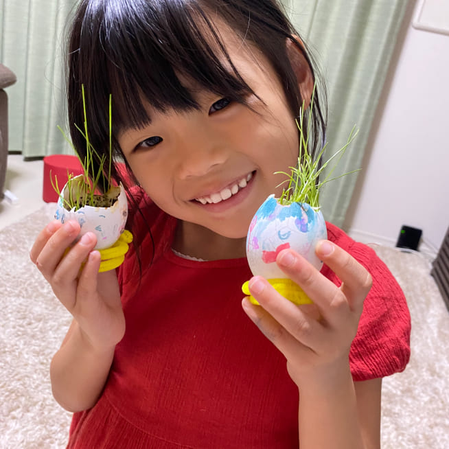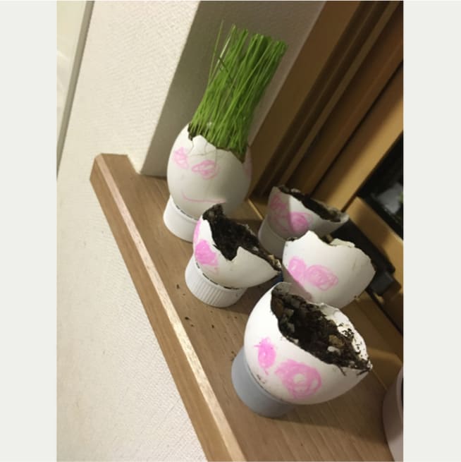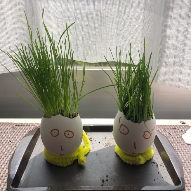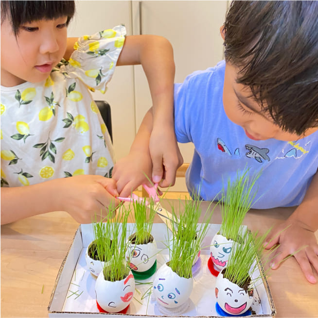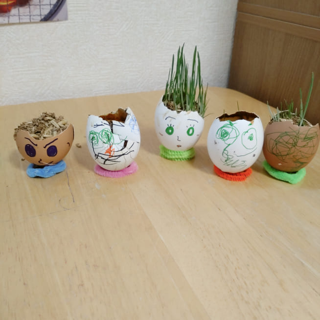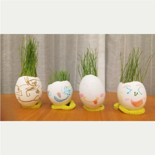 土を殻に入れたり、種を埋めたり、毎日お水をあげたり、伸びた葉をハサミで切ったり、お世話をしながら楽しく作品が作れたようです!