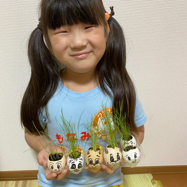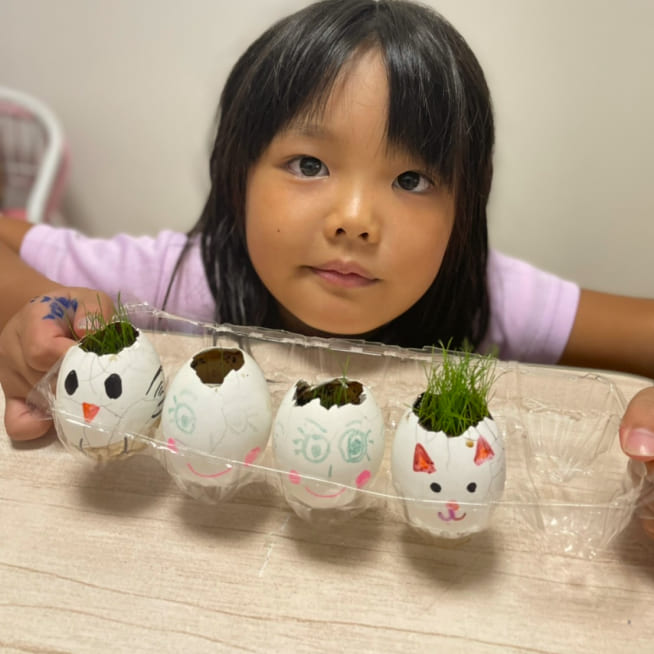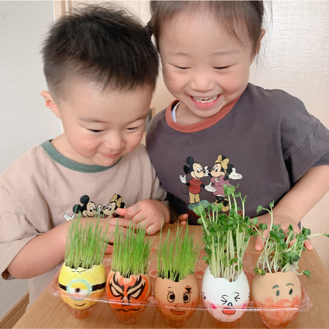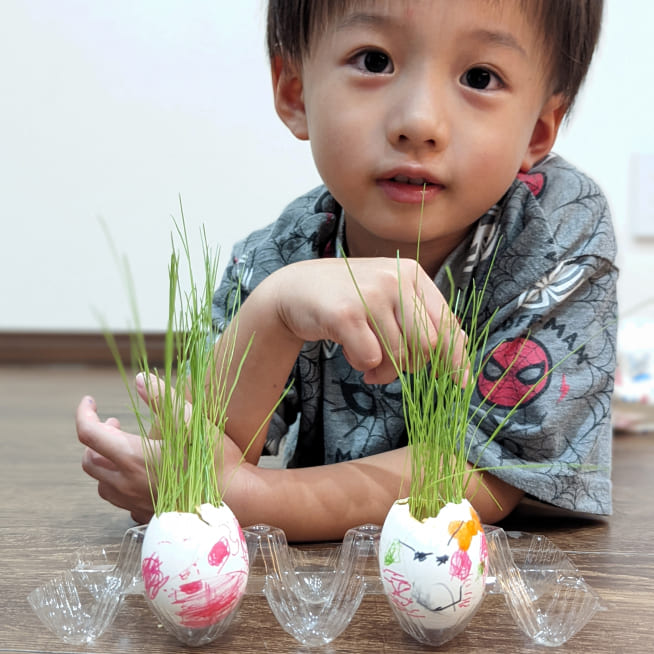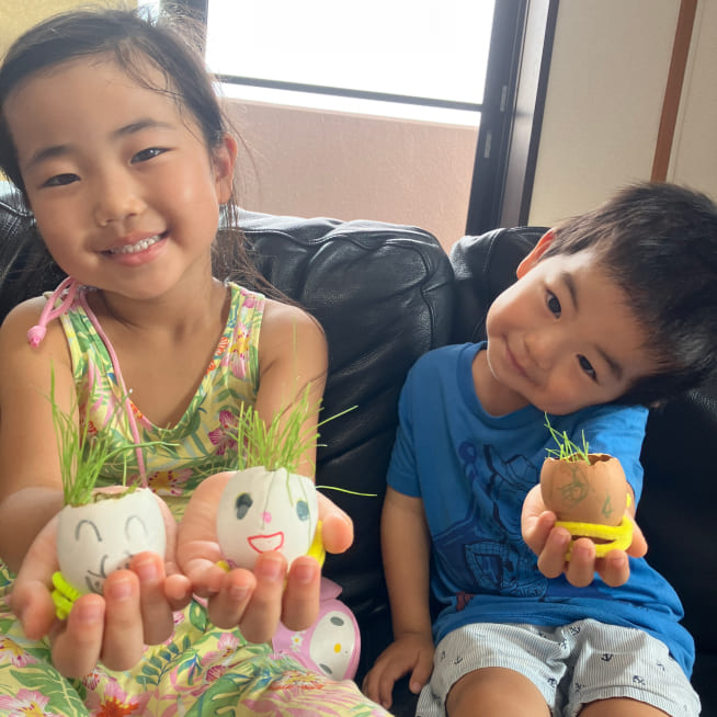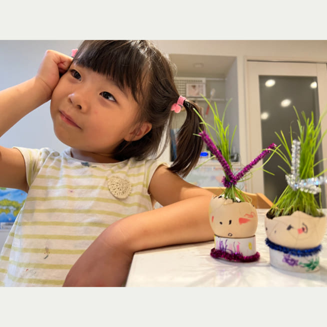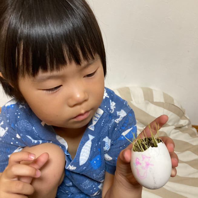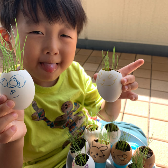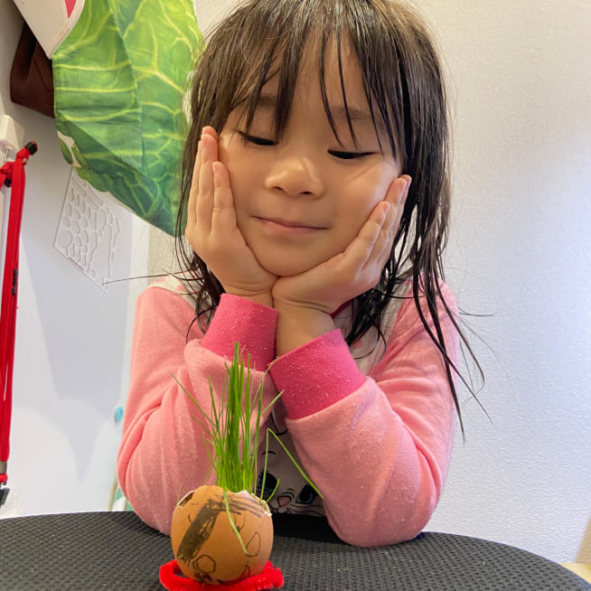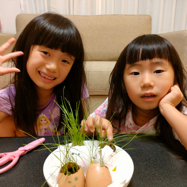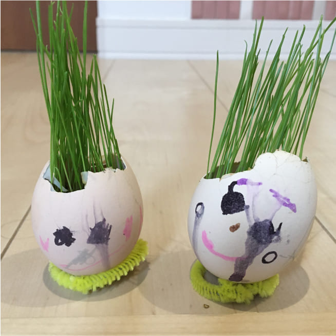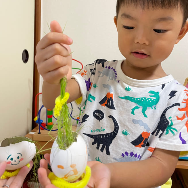 土を殻に入れたり、種を埋めたり、毎日お水をあげたり、伸びた葉をハサミで切ったり、お世話をしながら楽しく作品が作れたようです!