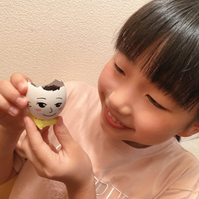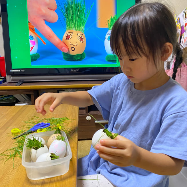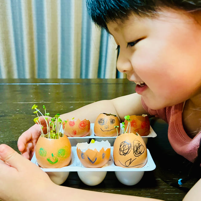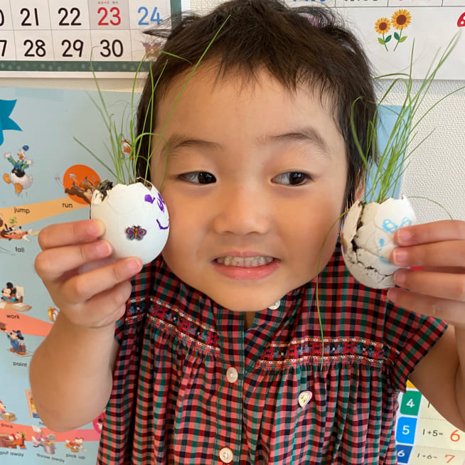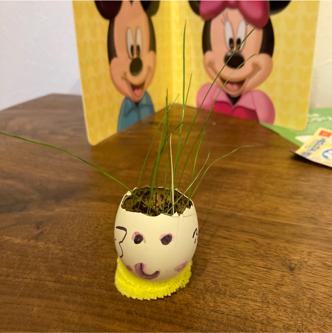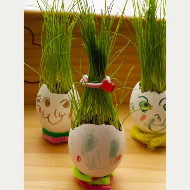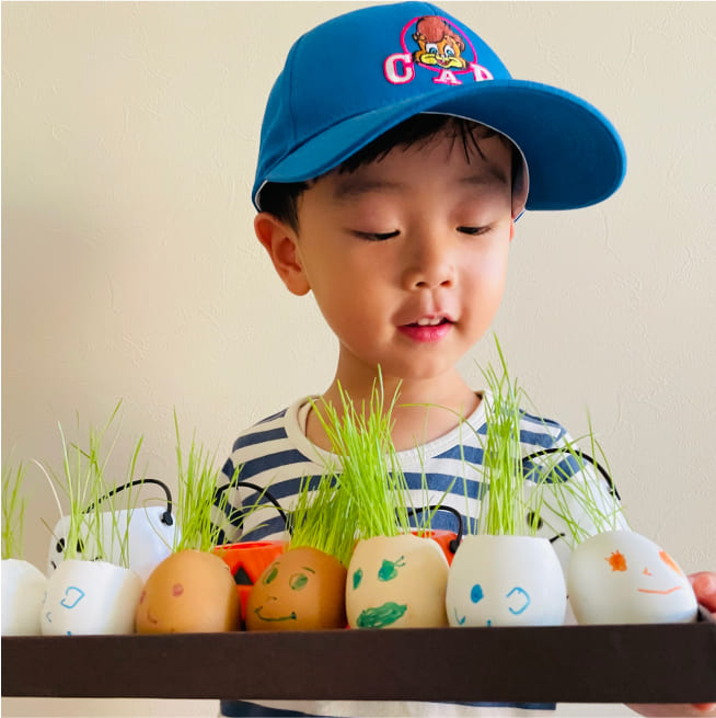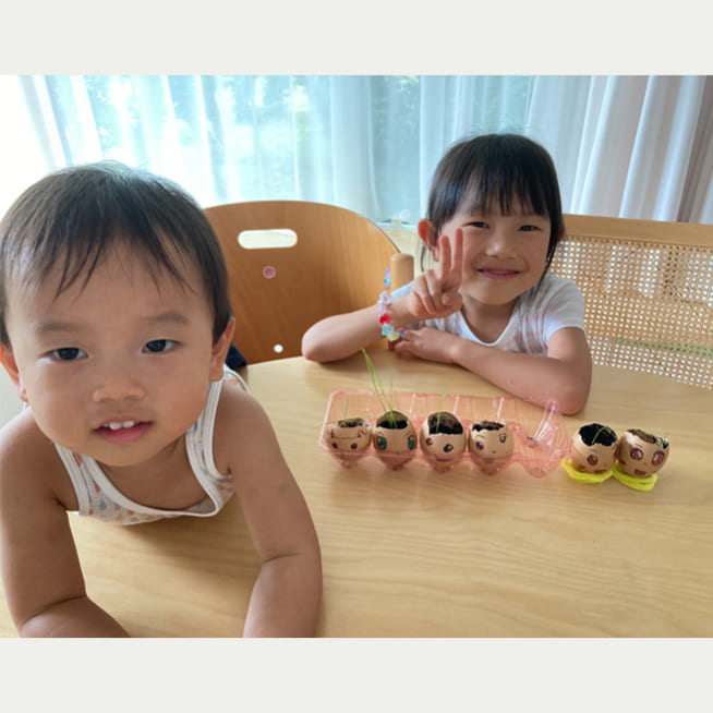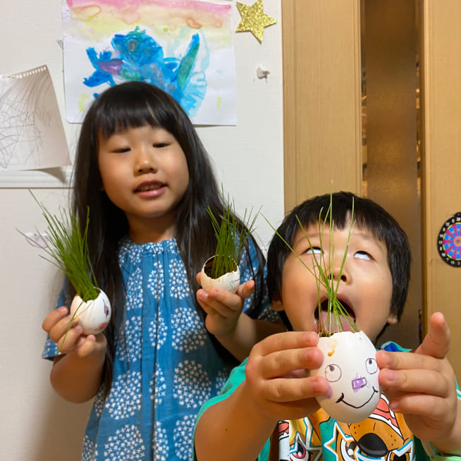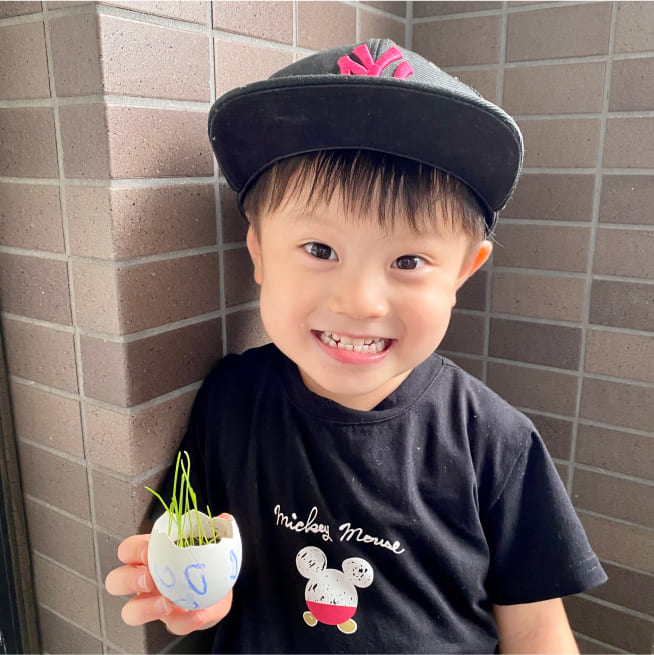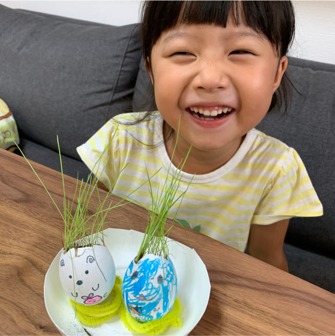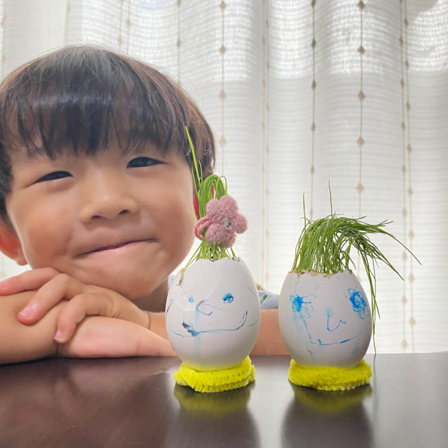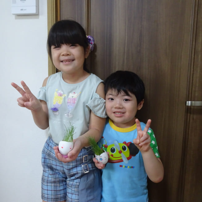 土を殻に入れたり、種を埋めたり、毎日お水をあげたり、伸びた葉をハサミで切ったり、お世話をしながら楽しく作品が作れたようです!