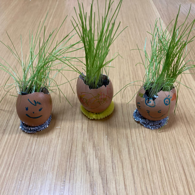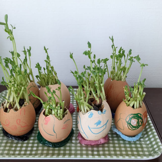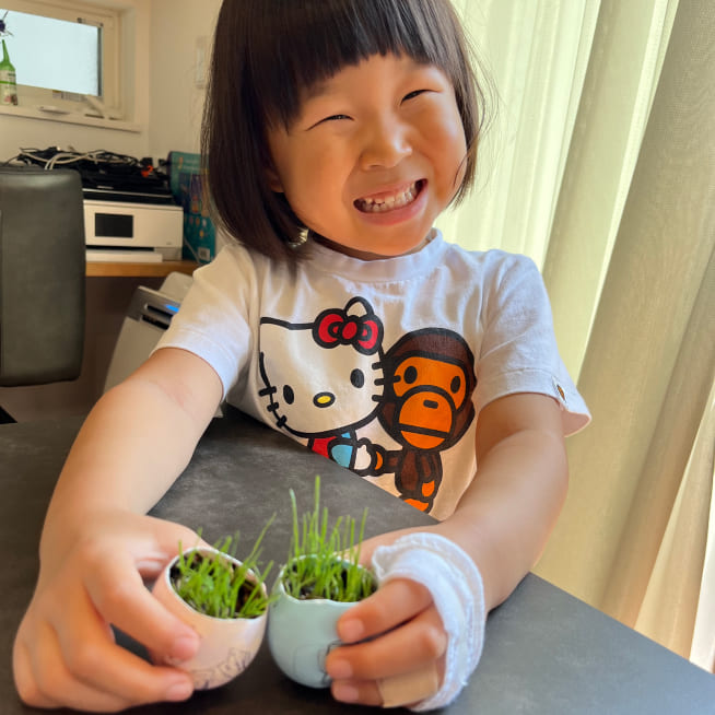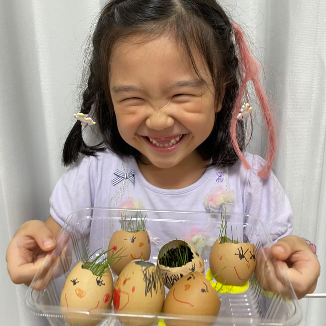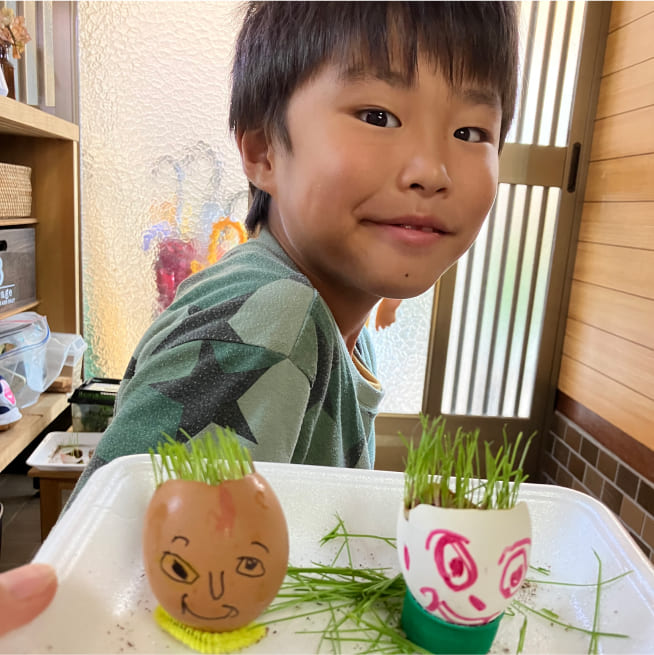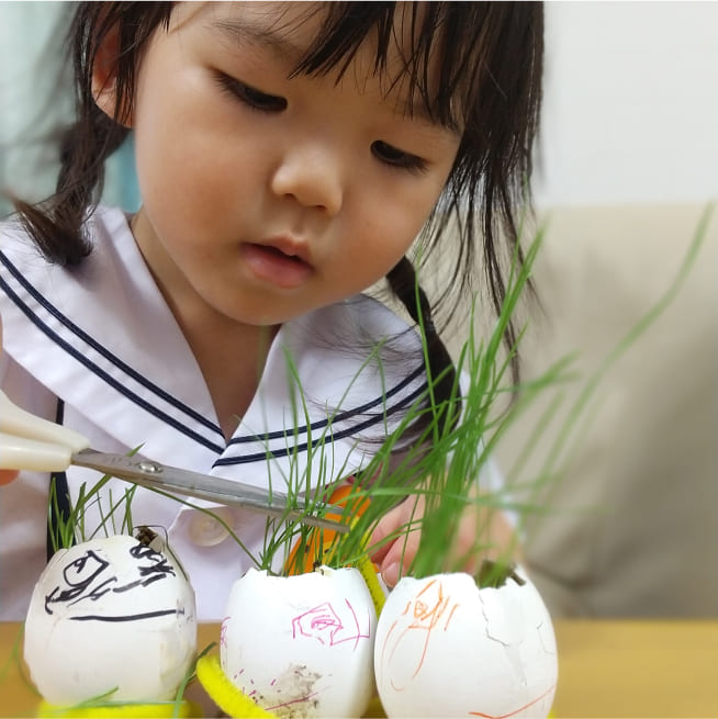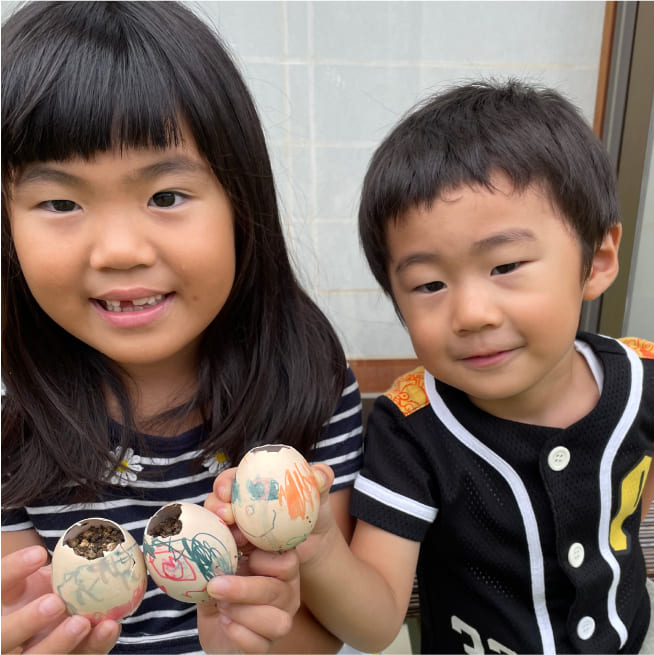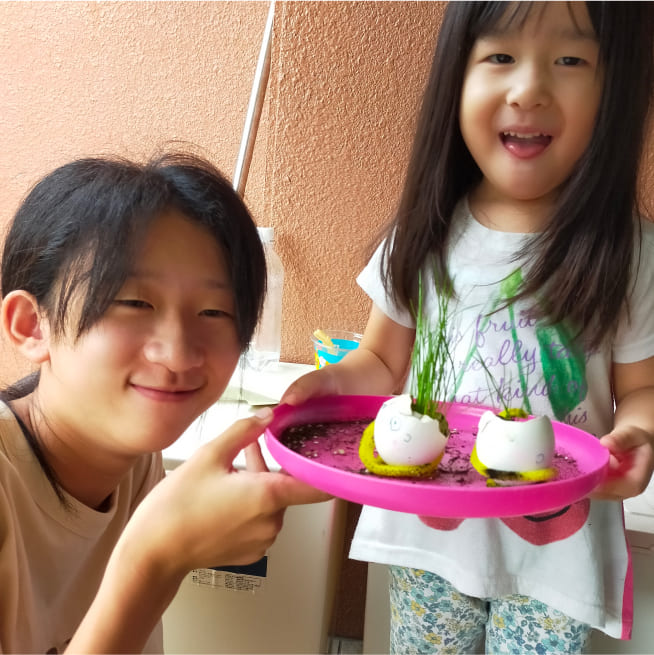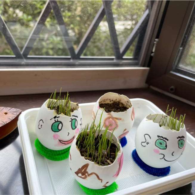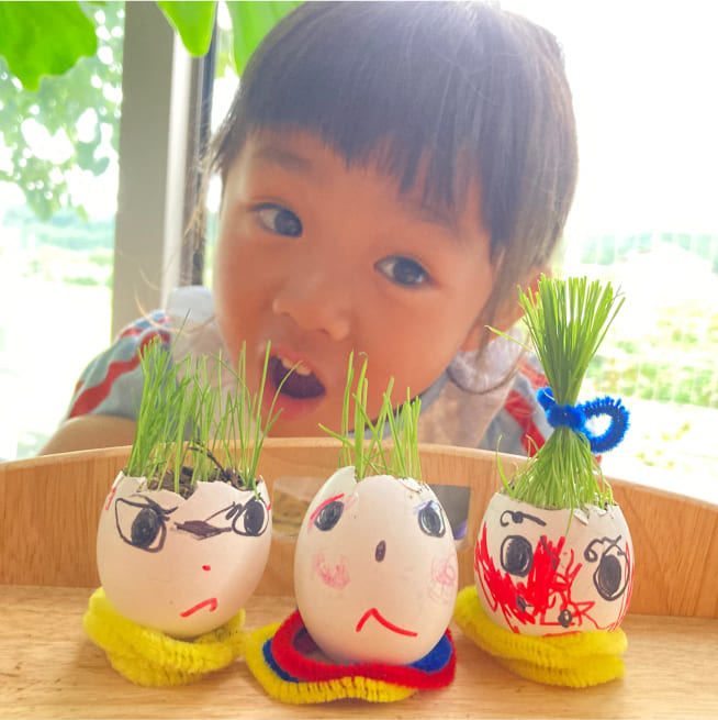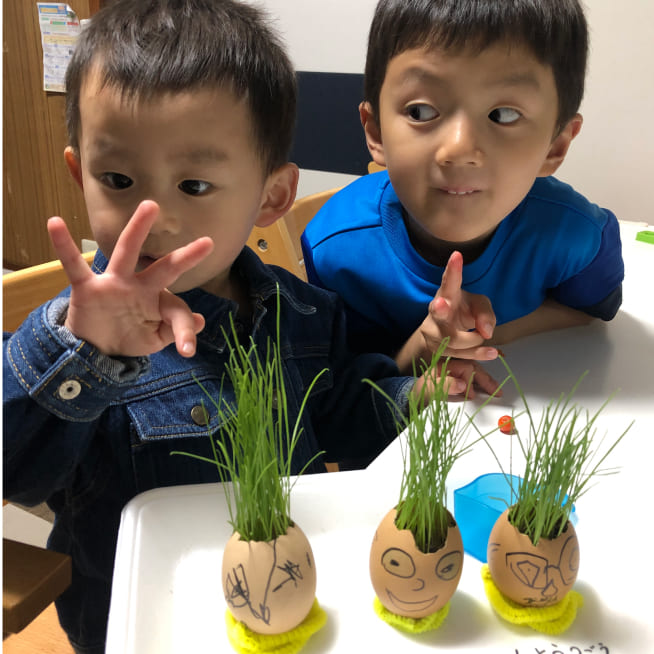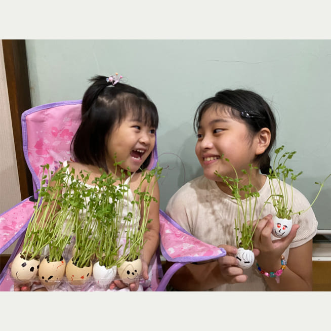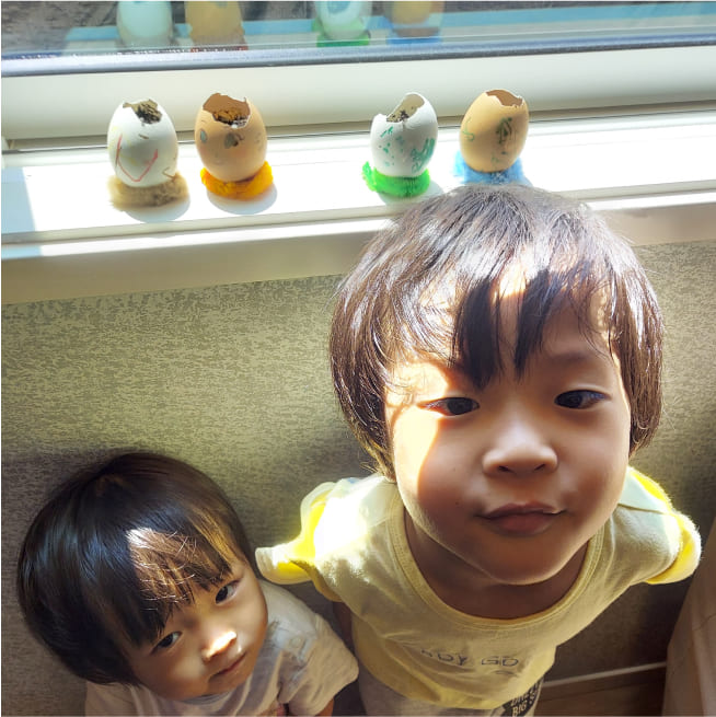 土を殻に入れたり、種を埋めたり、毎日お水をあげたり、伸びた葉をハサミで切ったり、お世話をしながら楽しく作品が作れたようです!