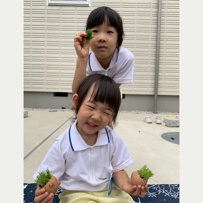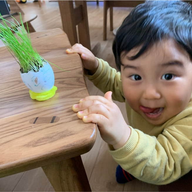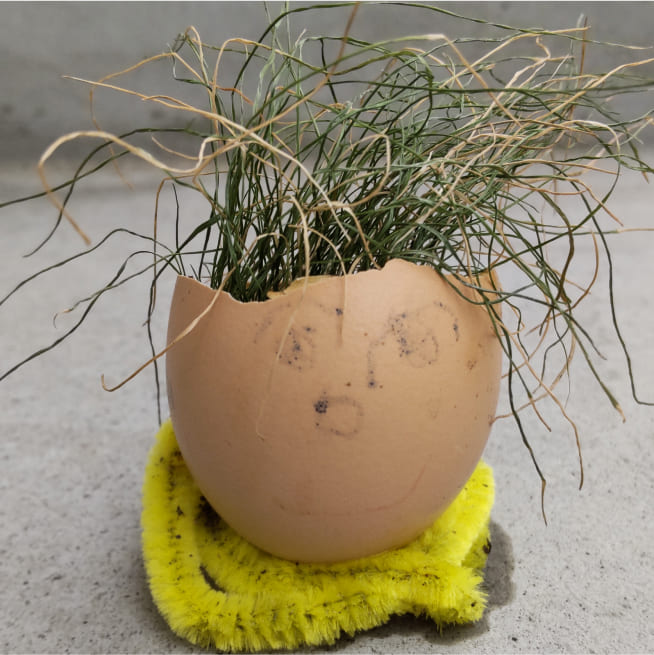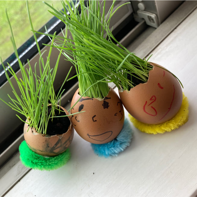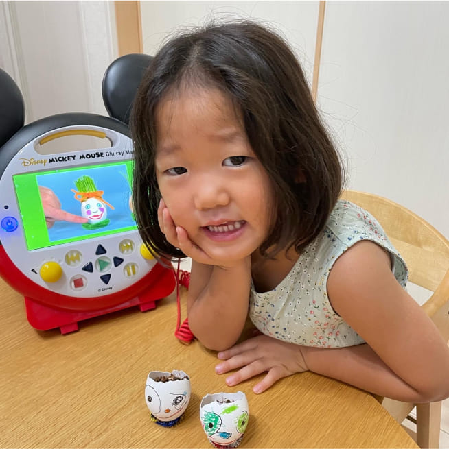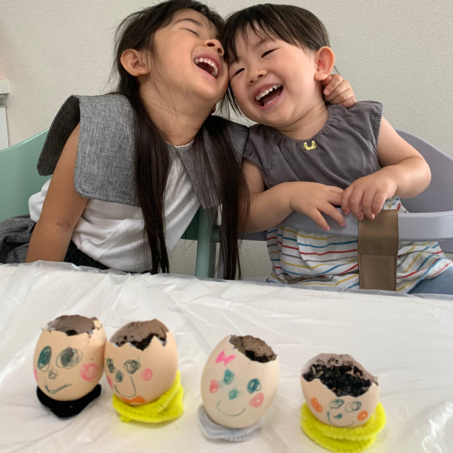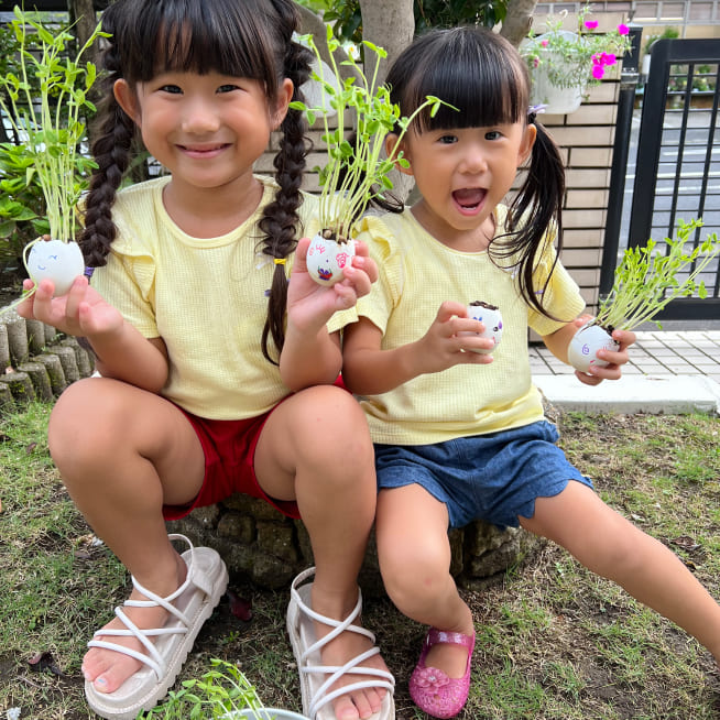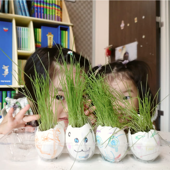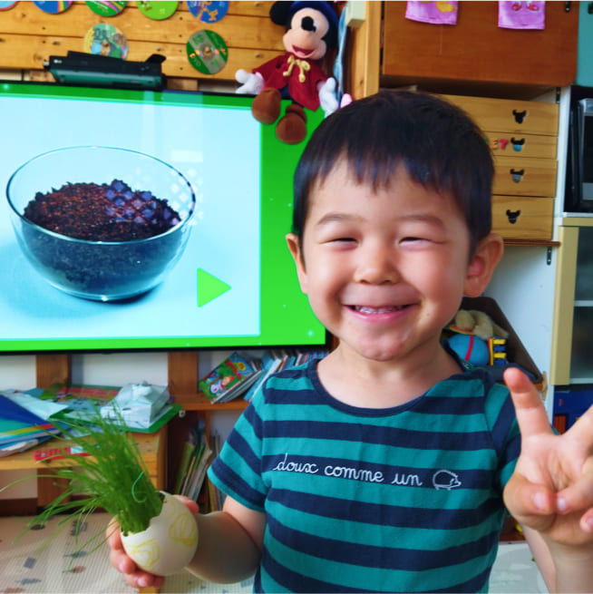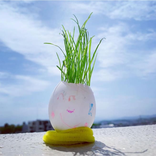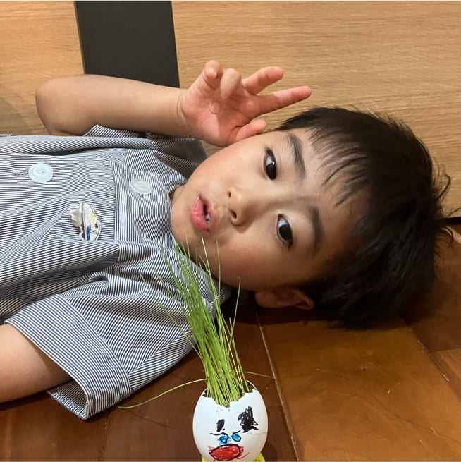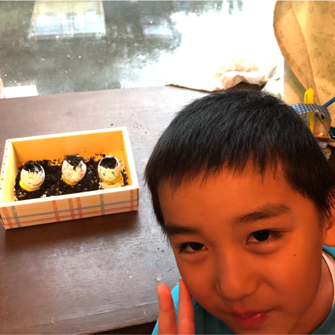 土を殻に入れたり、種を埋めたり、毎日お水をあげたり、伸びた葉をハサミで切ったり、お世話をしながら楽しく作品が作れたようです!