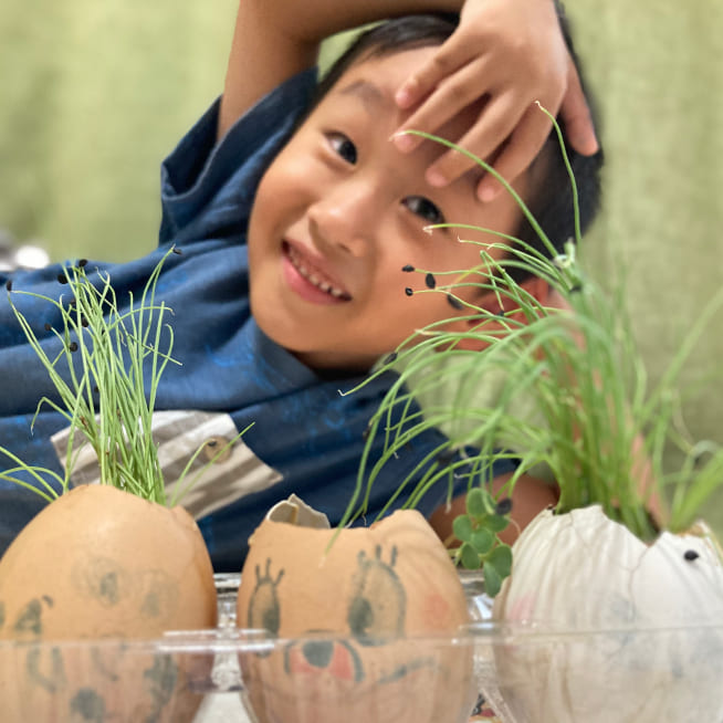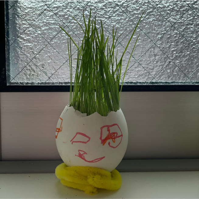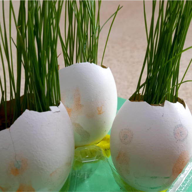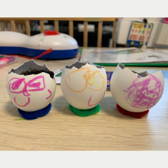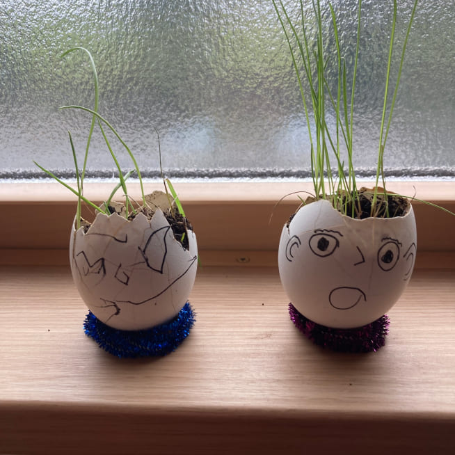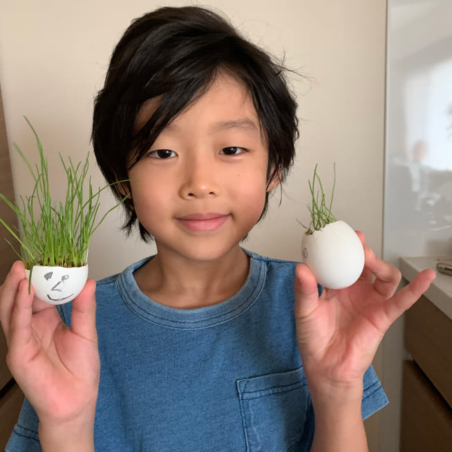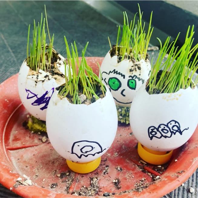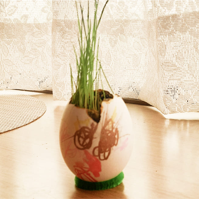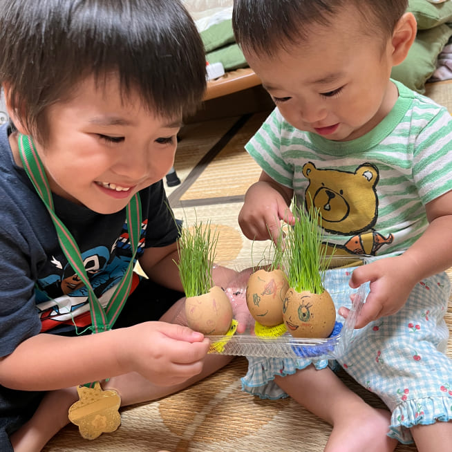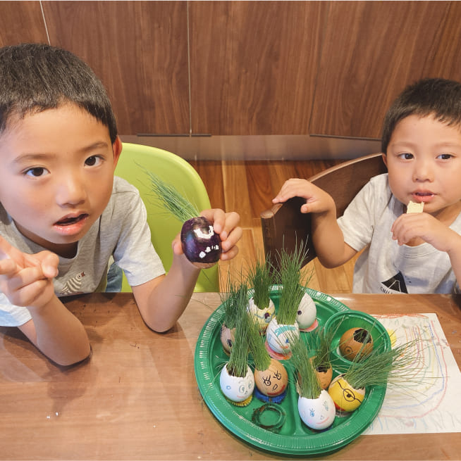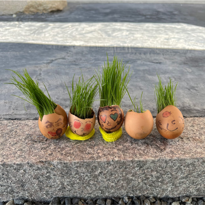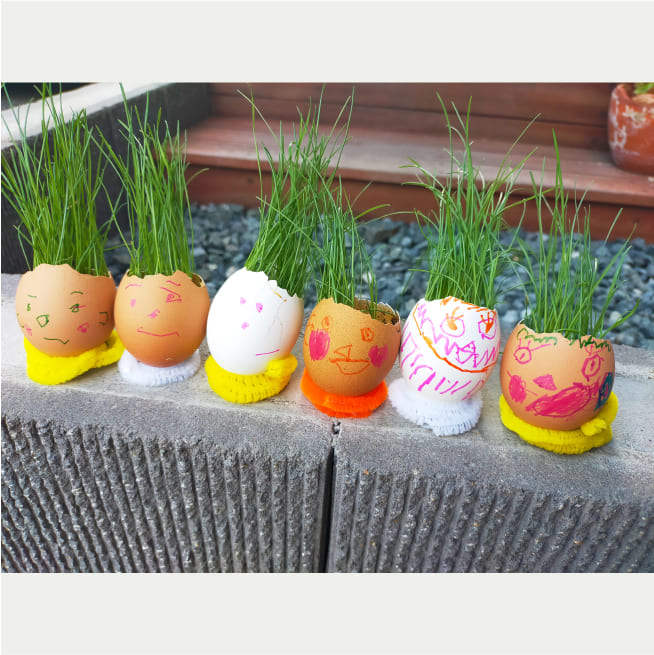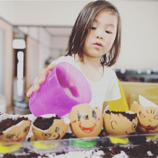 土を殻に入れたり、種を埋めたり、毎日お水をあげたり、伸びた葉をハサミで切ったり、お世話をしながら楽しく作品が作れたようです!