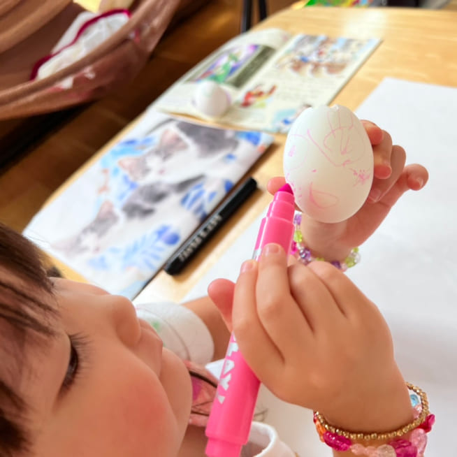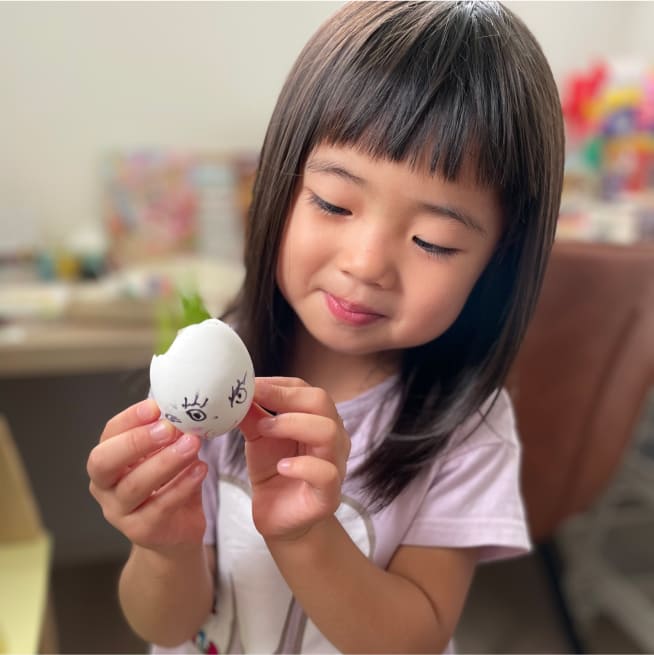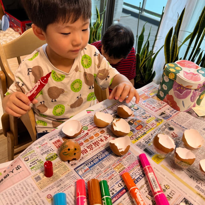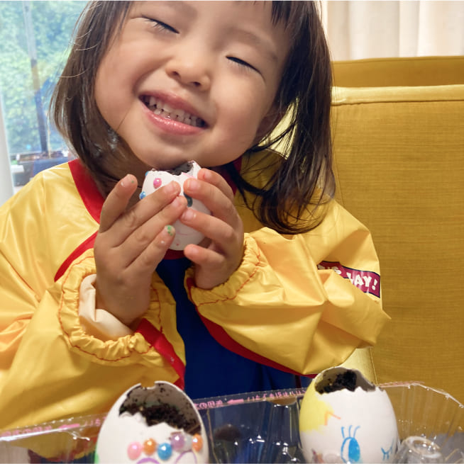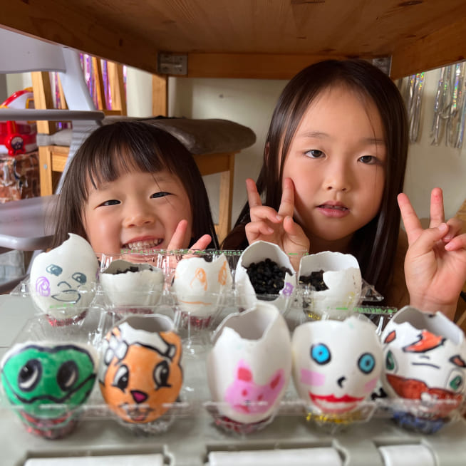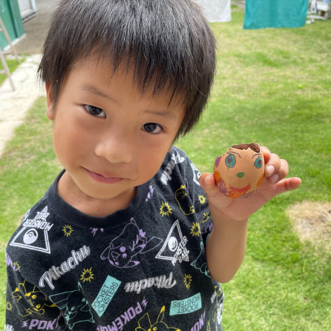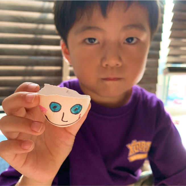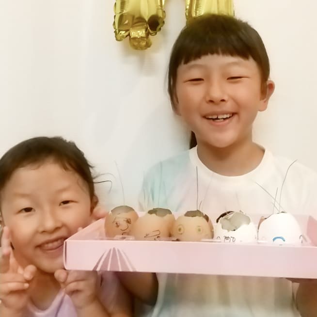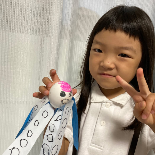 絵の具で染めて、マーカーで表情を描いて、シールでデコレーションをしました!きらきらのジュエルシールがポイントです!家族みんな、それぞれの個性がでたエッグヘッドができました!たまごが割れないように、そうっとやさしく持って、満点の笑顔ではいちーず!
