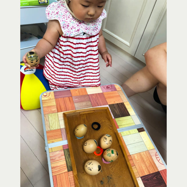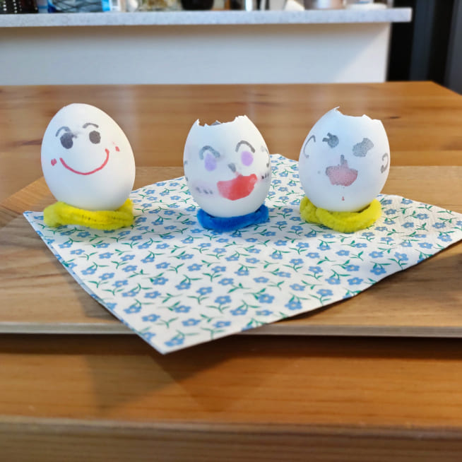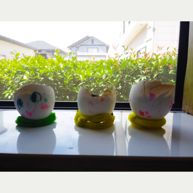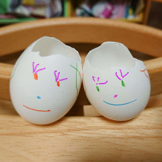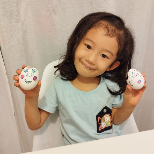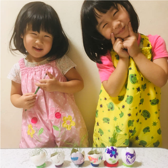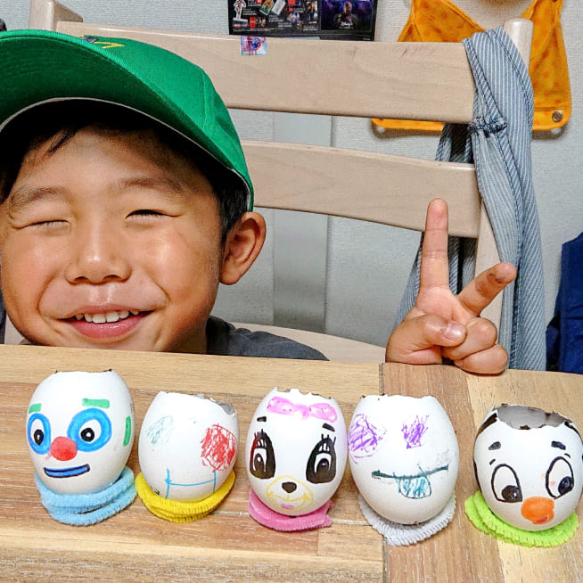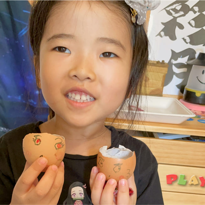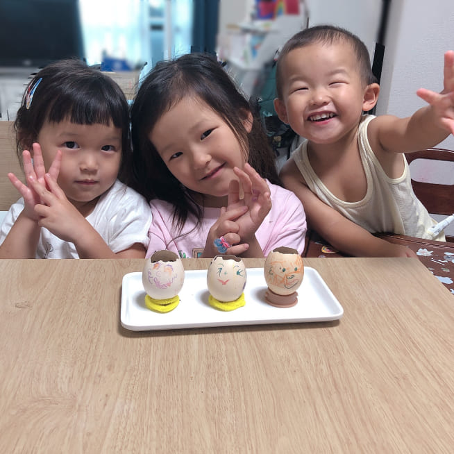 卵の殻の大きさに合わせて、妹、お父さん、お母さんと考えて顔を描いていました。