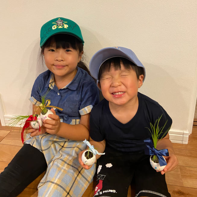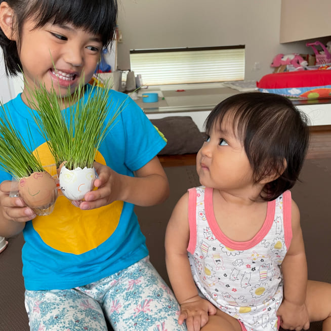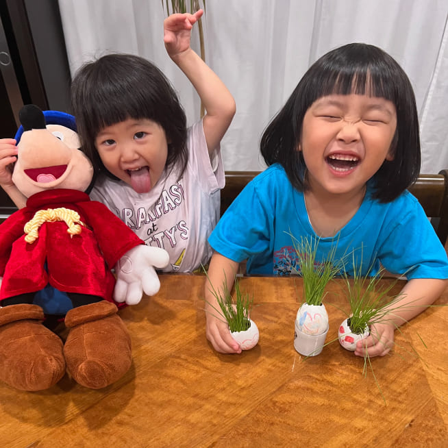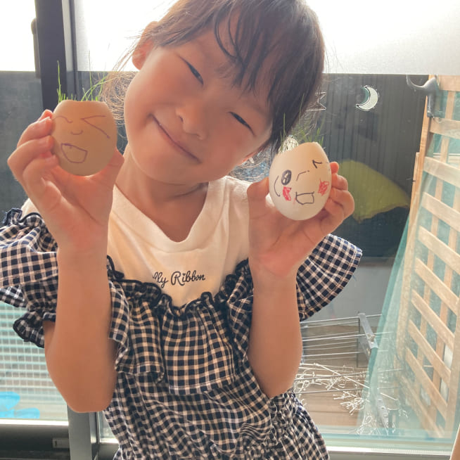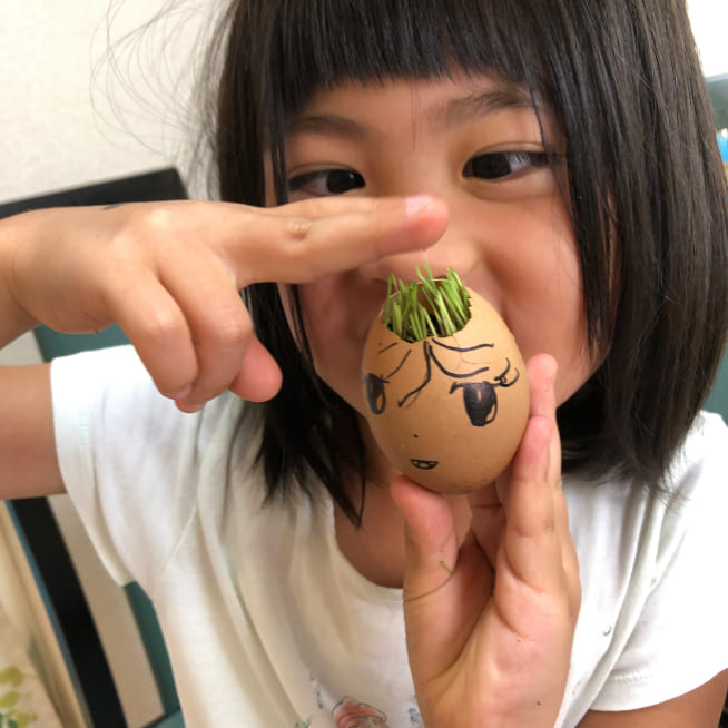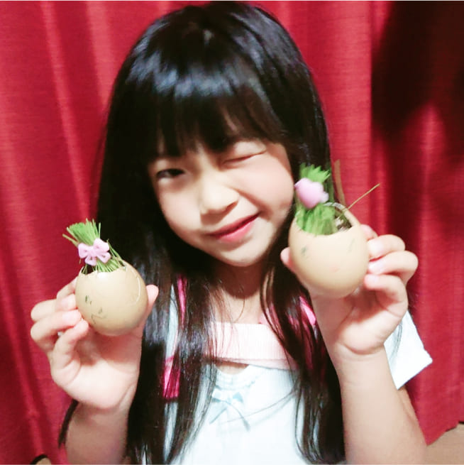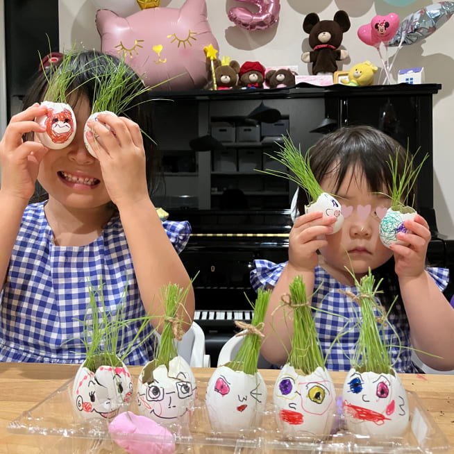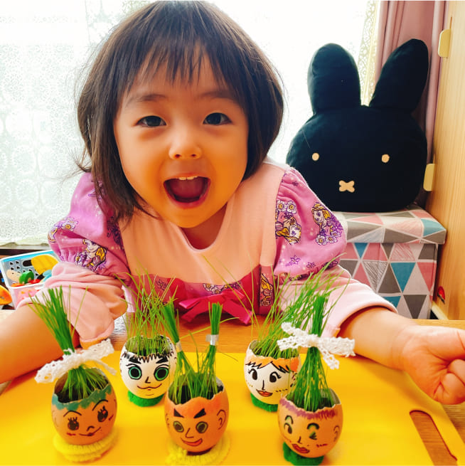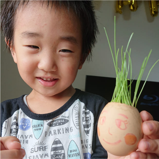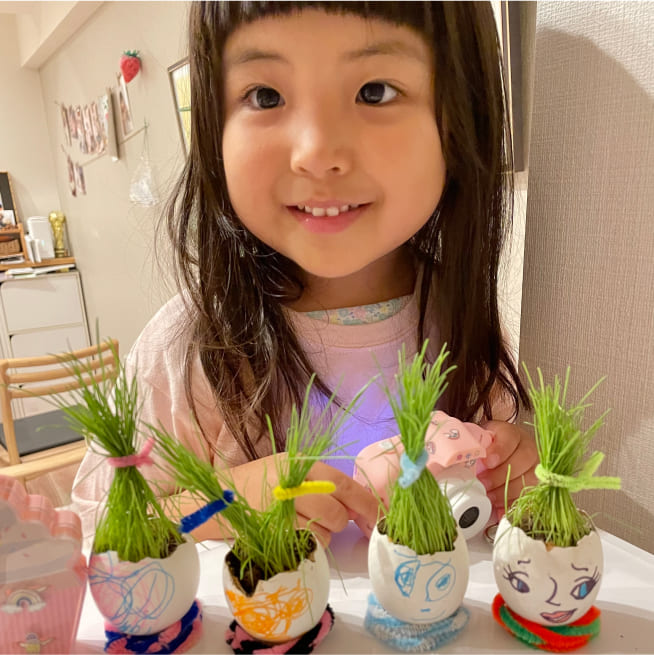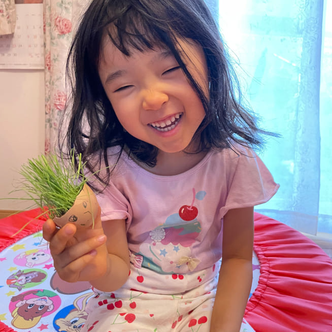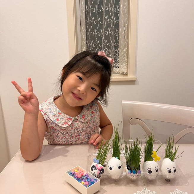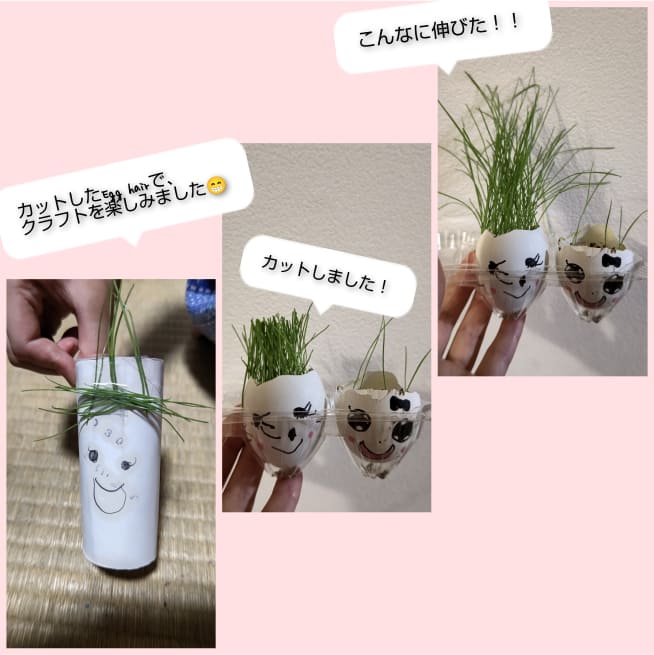 愛着がわくように、家族みんなの名前をつけました。葉が生えはじめると、誰の髪の毛が「ロング」「ショート」など毎日の観察が楽しかったです。葉が長くなってきたら美容院ごっこをしながらカットしてエッグヘッドファミリーにリボンをつけてあげました❤