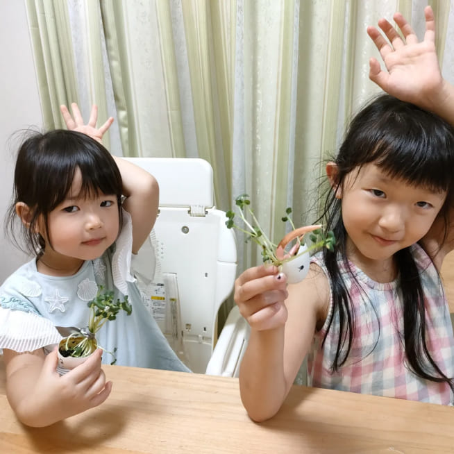 芽が出てくるまでまだかなまだかなと何度も見て、出てきた時はとっても喜んでいました。