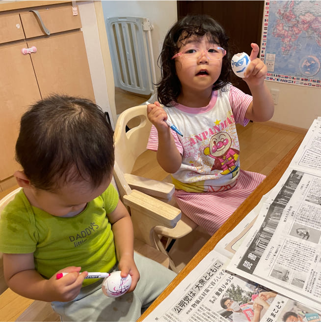 兄ちゃんが二つエッグヘッドを作りました。顔を描いて、自分の名前を付けました。弟は一生懸命真似しました。