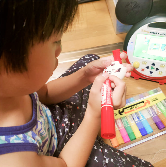 はじめてのレッツプレイでしたが、映像を見ながら無理なく楽しめました。色付けを促すと、水色のペンを手に取り嬉しそうに塗り塗り…鼻水くん♡と速攻でお名前が決まりました。