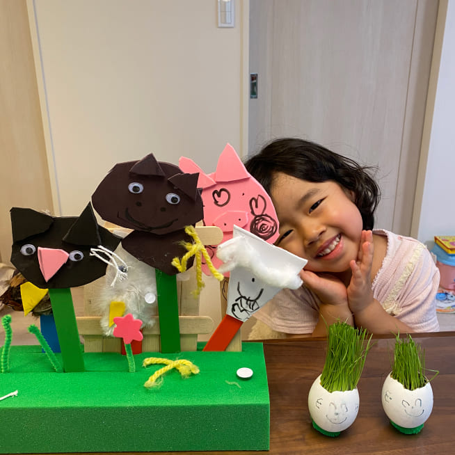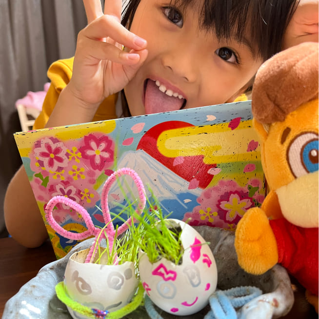 しっかり英語を理解できているか確かめるために、自分一人で仕上げてもらう事を意識して制作しています。子供たちも「自分でできた!」という達成感を感じられた制作でした!