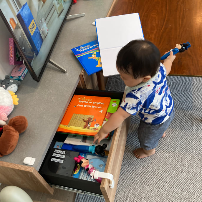 使ってほしい教材は、あえてベビーロックをかけられる引き出しにしまっちゃいます。たまにロックを外して開けておくと、まんまと下の子が「あ、開いてる!」と近寄ってきて、絵本やペンをひたすら出すんです。すると上の子もやりたくなるみたいで、遊び始めてくれます!