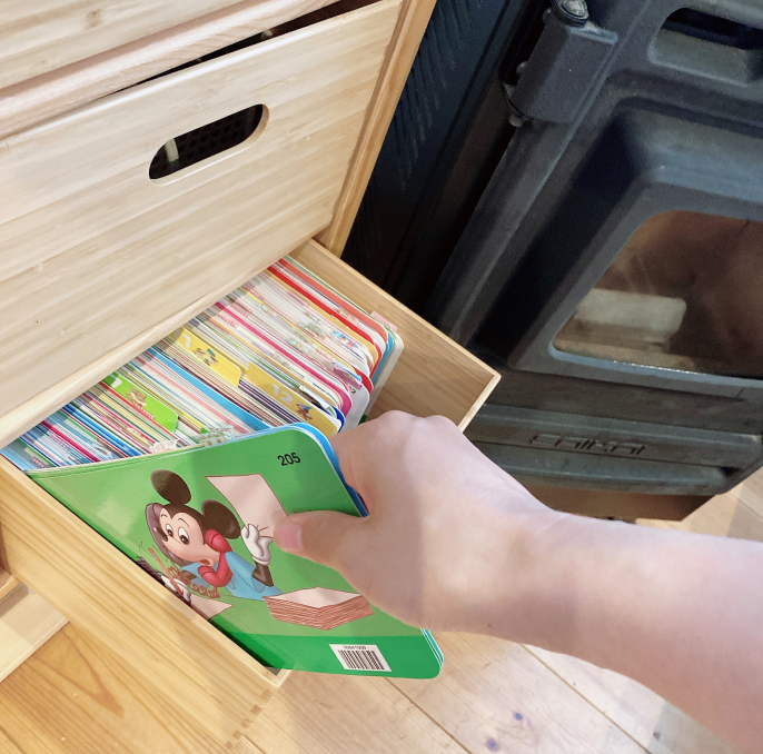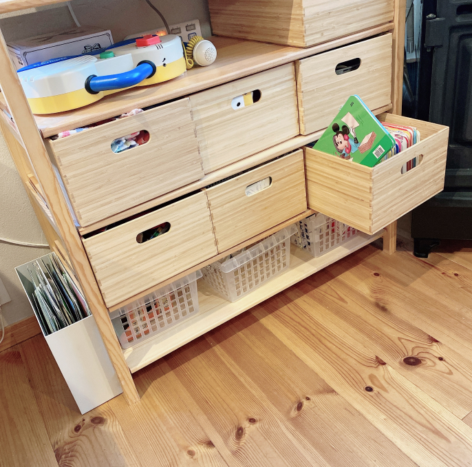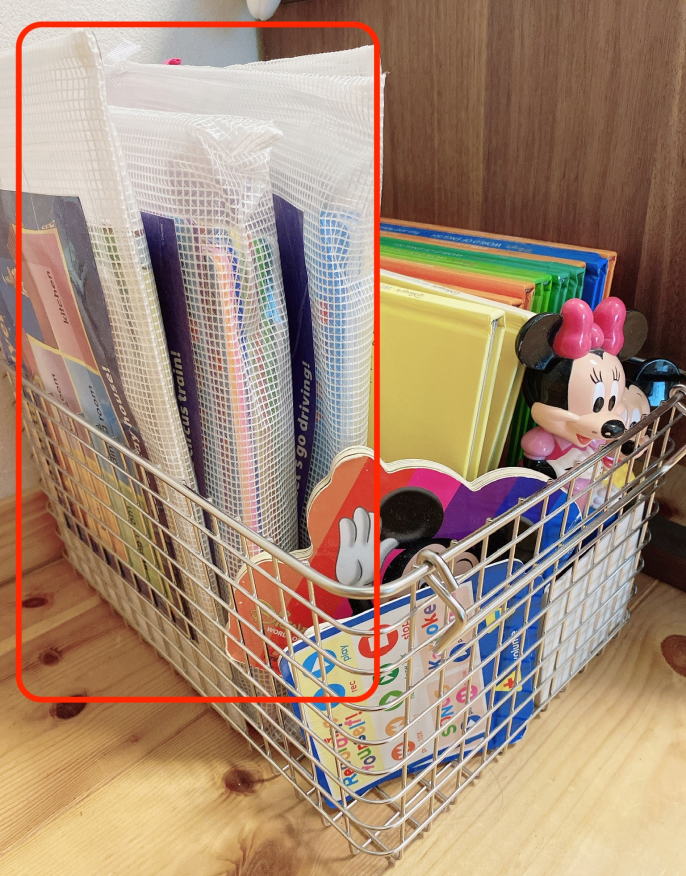 そこで、無印良品の網カゴの中にマジックペンとカード類、絵本を入れて、子どもたちの目に入りやすいテレビの横に!ふと目に入ると「これで遊びたい」という気持ちになるようで、触れてくれるようになりました。我が家では、「使いたい場所にある」、「家のあちこちにDWEがある」という収納方法が良いみたいです。