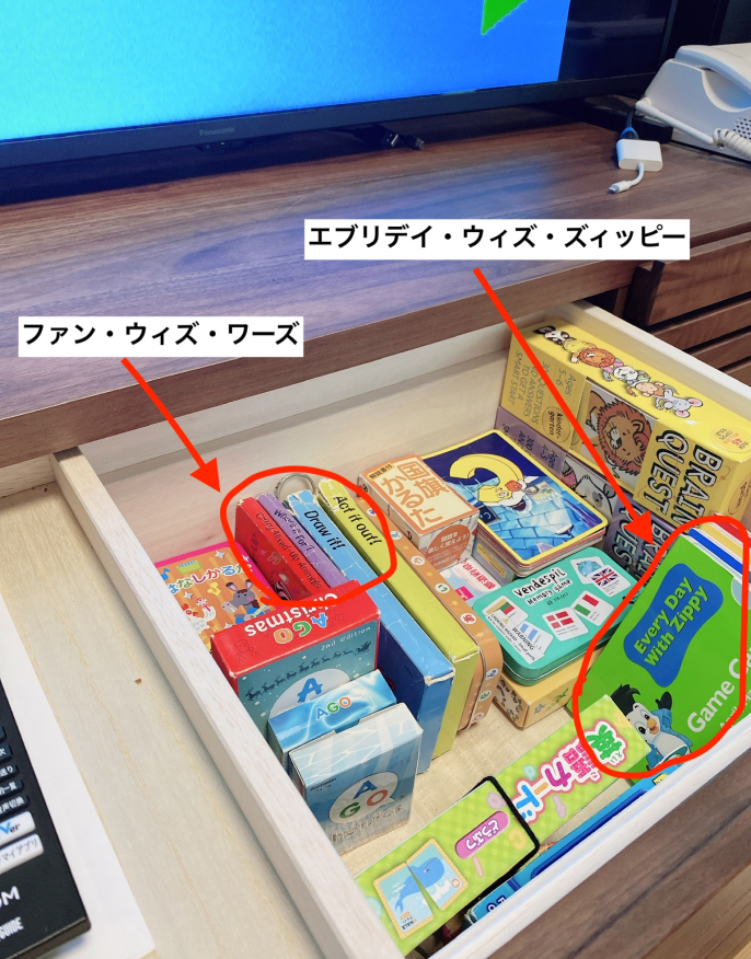 ゲーム・カードは、テレビ台の引き出しに。「どっちのほうがたくさんカードをマッチングできるか」ゲームやかるた遊びがお気に入り!