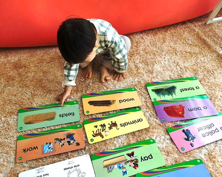 読んでもらうだけだとつまらないかなと思って、床に10枚並べて、私が読み上げた単語のカードを見つけて取ってもらって、その単語をそのまま子ども自身で読んでもらっています。