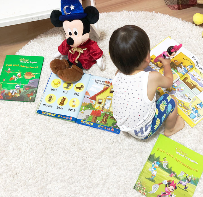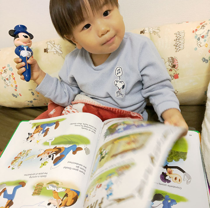 1歳頃からDWE以外のDVDをかけ流したり、Disney+のアニメを英語で見せたりしていて、そうすると丸の形を見て「O(オー)」と言い始めて、2歳になる前にはアルファベットのほとんどを読めるようになっていたんです。それで、英語に興味があるんだなと思って。