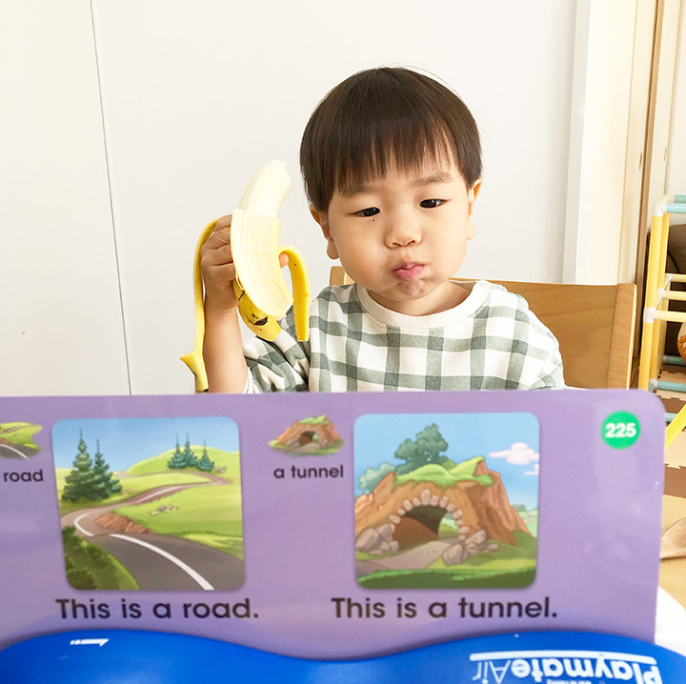息子が選んだBookを一冊寝室に持って行き、ベッドで読み聞かせ。ペンを使って、一冊分読みます。周りにおもちゃ等がない環境で読み聞かせをすると、集中して聞いてくれます。
