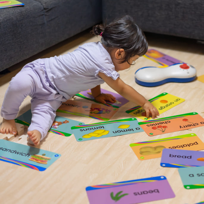 娘が「やりたい」と言ってTAC(トークアロング・カード)を持ってきたら一緒に遊ぶ。“Where is an apple?” と言ったら娘がappleのカードを探す、というようなゲームをするときも。