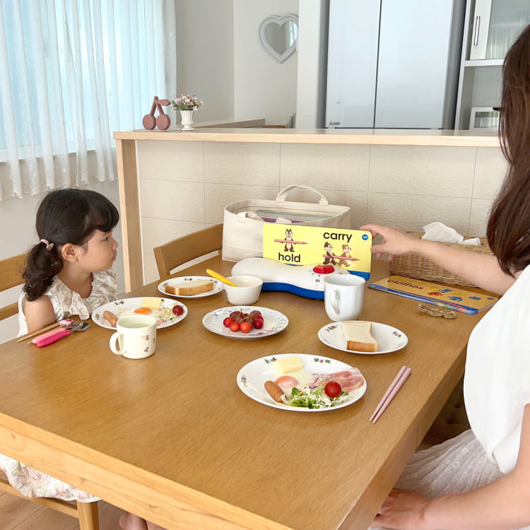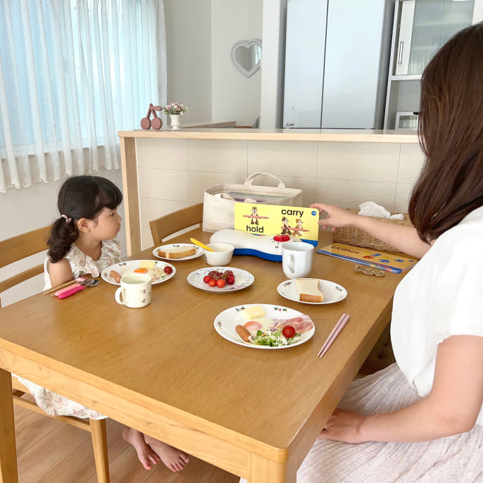 わざわざDWE時間を作ろうとすると、子どもの機嫌もあるのでうまくいかないので、「朝ごはん」のタイミングを活かしてます!