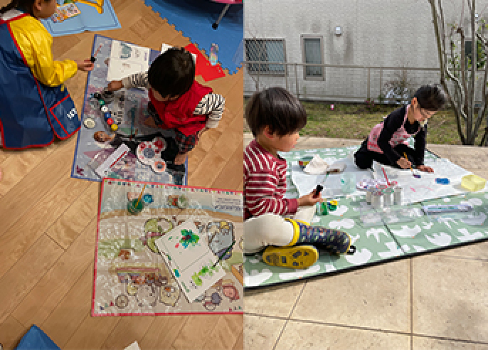 ・何をして遊ぶかは、子どもたちが決める。DWEのときは、レッツ・プレイの工作やマジックペンで遊んだり、ストレート・プレイでお気に入りのところを見たりすることが多い。