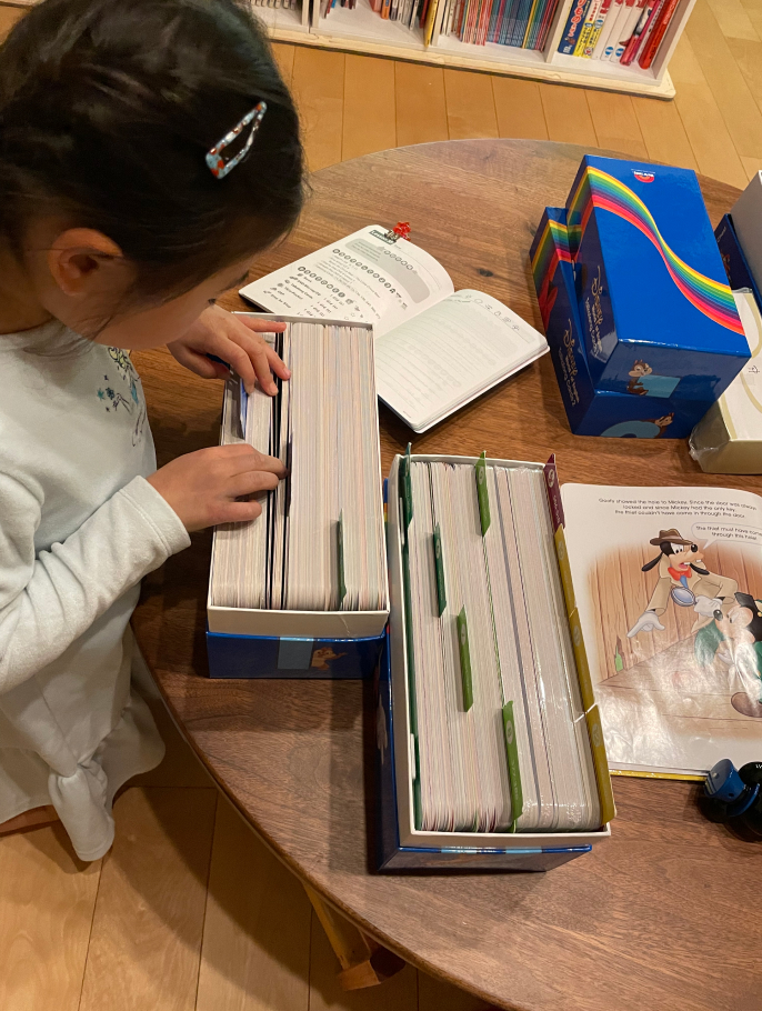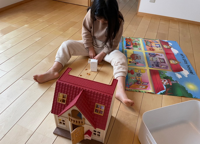 何事もきちっとやりたいと思ってしまう性格の私は、はじめの頃はガイドに沿った順番や遊び方で進めようとしていました。でも、私の時間がなさ過ぎて、現実的ではありませんでした・・・。そこで、進め方にこだわるのはやめて、使い方もほとんど教えず、子どもの好きなように教材を使ってもらうようにしました。すると、いつの間にかDWE以外のおもちゃと組み合わせて、独自の遊び方で楽しんでいました。何事も自分のやり方でないと納得しない上の子の性格に合っていたようで、とにかく今はこのままDWEに馴染んでくれればいいと思っています。
