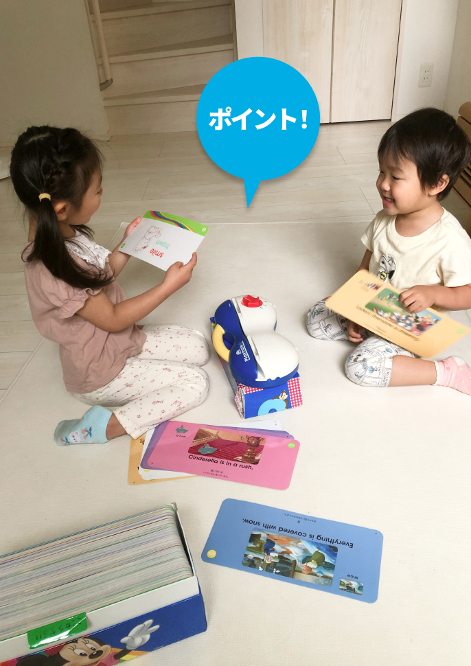 そして朝食後、保育園の準備が完了したら、トークアロングカード(TAC)に取り組みます。娘たちに「今日はどっちが先生? どっちがお姉さん?」と声をかけると、ごっこ遊びが大好きな娘たちはすぐに取り組んでくれます。先生役が「What’s this?」と声をかけて、お姉さん役が答えるという方法で、毎朝5~10分、カードを5枚ほど通しています。