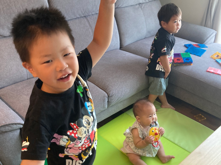 とにかくお利口さん。お兄ちゃんたちの隣で毎日、英語のインプットのシャワーを浴び、英語力をたっぷり蓄積中。