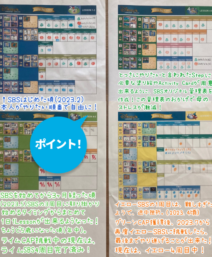この仕組みでブルーのSBSを2周やり終えた頃、長男本人が“SBSは1レッスンをまとめて、順番通りに見たほうがいろいろスムーズにできるんだな”と理解するようになり、DVDを最初から順番通りに見てくれるようになりました。