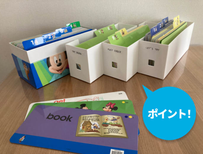 TACの進捗管理にはボックスを活用しています。今週やるべきカードは「LET’S TRY」、子どもたちが保育園に行っている間にチェックするカードは「MUST CHECK」、時間を空けて再度やるべきカードは「TRY AGAIN」に入れ、CAPに応募できるレベルになったらカードの端にシールを貼り、ミッキーのボックスに片付けています。