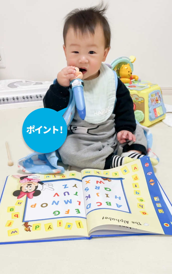 1歳の頃は、DVDやCDのかけ流しの代わりに、お気に入りのミッキー・タッチペンを使って、♪ABCソングばかりを聞いていました!