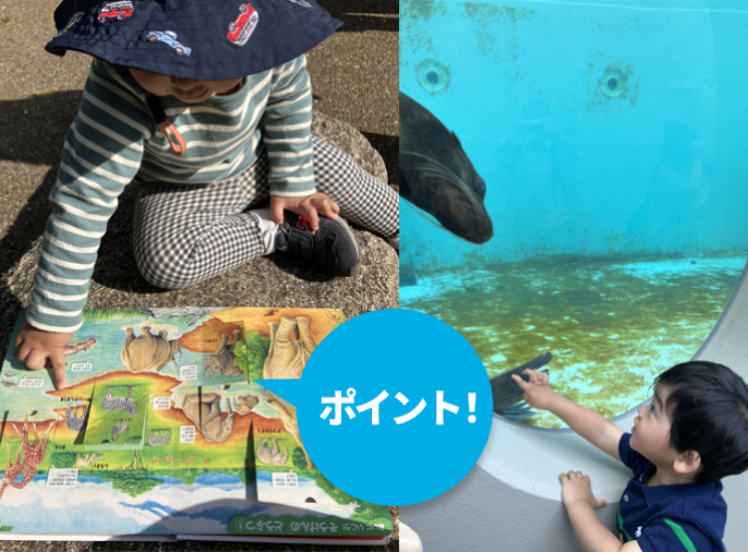 例えば2歳の長男は今、生き物に興味を持っているので、動物園や水族館に頻繁に通ってなるべく本物をたくさん見せるようにしています。お出かけの前には、トークアロング・カード(TAC)の動物のカードを集めて通したり、英語の表記も載っている図鑑で生き物の名前を調べたりして、教材や英語との結びつきを作っています。
