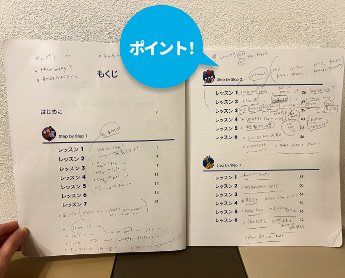 教材は、毎日2人でじっくり取り組んでいます。日々の取り組みに役立てているのは、教材のガイドブックです。私が事前にしっかりと読み込んでおくことで、効率よく教材を活用できるようになりました。例えばステップ・バイ・ステップ(SBS)は、ブルーレイを見る前にガイドブックで学習のポイントを確認して、英文法の押さえるべきポイントをまとめておきます。