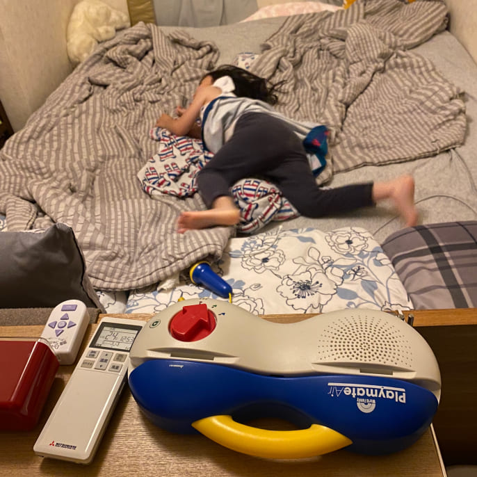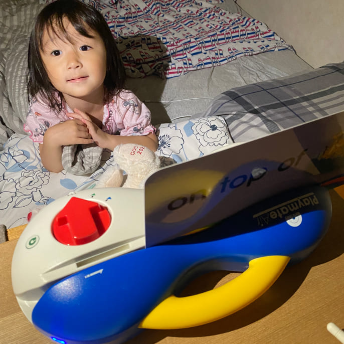 リビングにプレイメイトを置いていたときもありましたが、遊んだあと「お片付け」しないといけないですよね。でも片付けてしまうと、目につかなくなってしまうので習慣化しづらくて。そこで、ベッドの横にプレイメイトを置いてみました。片付けいらずで、目につきやすく、娘もベッドの上だとリラックスして、楽しそうに聞いたりリピートしてくれるようになりました。