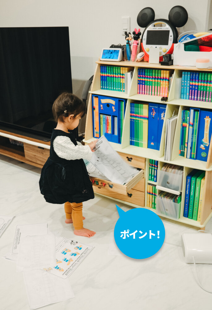 具体的には、リビングに子どもサイズのテーブルとイスを用意し、Kid’s Worldで先生たちが使っている文房具もそっくり同じように揃えて、塗り絵などの用紙も何枚も印刷して、娘が取り出しやすい引き出しに入れています。使いやすい家具と道具をセットしておくことで、すぐに遊び始めることができるので、動画コンテンツにますますハマり、英語ばかりがどんどん上達したのだと思います。