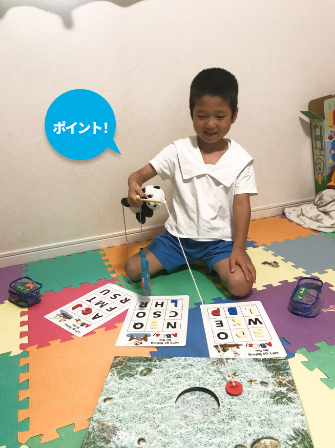 お気に入りの教材は、レッツ・プレイのフィッシングです。アルファベットでビンゴゲームをしたり、自分の名前や英単語を作ってみたり。大好きなトーマスの人形に「次はキミの番ね」と言いながら釣りをさせたりしながら、おままごとのように楽しく遊んでいます。
