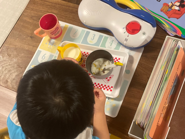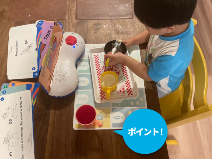 TACに取り組むタイミングも工夫しました。TACは他のおもちゃよりも優先順位がかなり低いので、普通に遊ばせるのは難しいと考え、長男の大好物であるヨーグルトを食べている間にだけ取り組むことにしたんです。朝晩の食後に、食卓の上で私が通したカードを、長男はヨーグルトを食べながら声に出してリピートします。