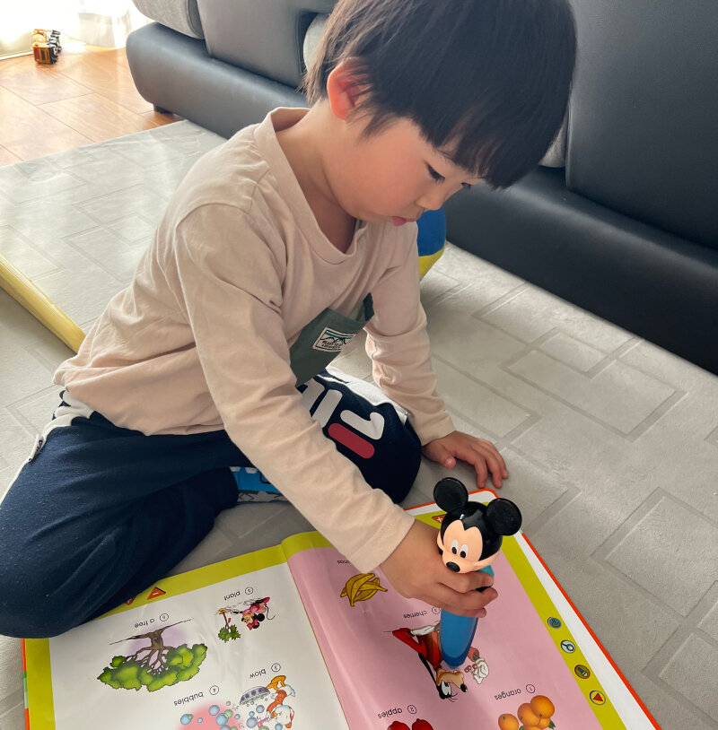 起きたらすぐにミッキー・メイトのスイッチをオン。家の中ではいつでも英語の音声が聞こえるようにしています!