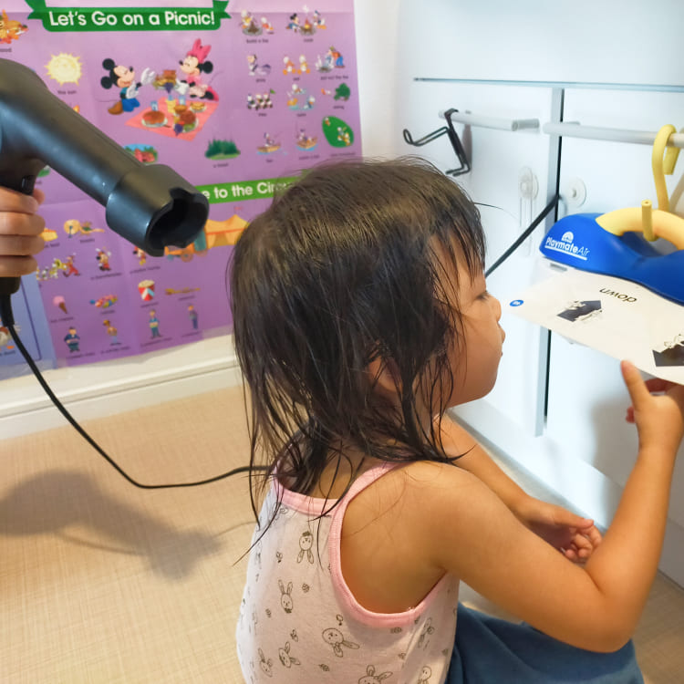 19:00 洗面所で子どもたちの髪の毛を乾かす 💳