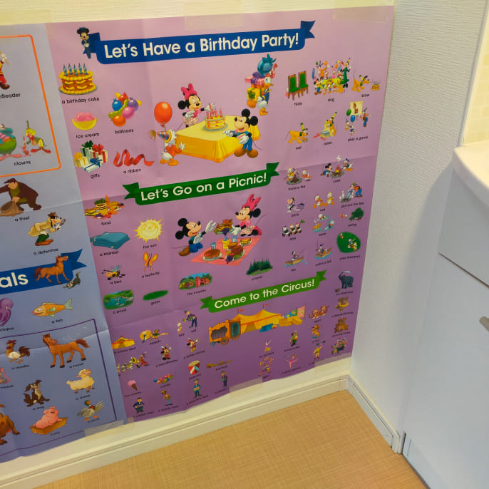 シング・アロングの絵辞書ポスターを発泡スチロールみたいなボードに貼る、という工夫をやりたいなと思ったんですけど、うちには広げるスペースがなくて…。試しに冷蔵庫に1枚だけ貼ってみると、今度は娘がお風呂から出て、髪も乾かさずそこに走って遊んでしまう始末。そこで、洗面所に残りの3枚を貼ってみました。すると!ポスターで遊んでいる間にドライヤーで髪の毛を乾かせるように!私やパパがお風呂上がりに脱走する娘を追いかけてつかまえる必要もなくなりました(笑)。
