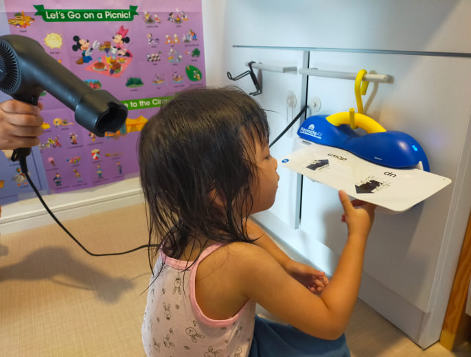 💡工夫2💡 お気に入りの教材は洗面所!お風呂上がりに、じっとできない娘対策。