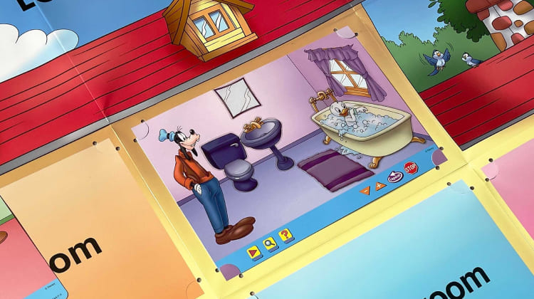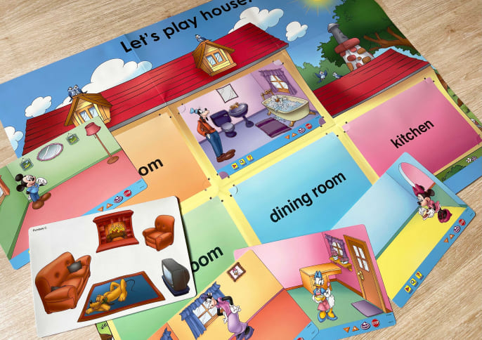 バスルームやキッチン、リビングルームなどなど、、指示にあわせて、家具のシールを配置していけば、ミッキー達のお部屋の完成です!