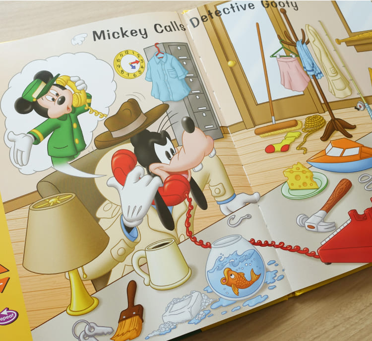 ファン・アンド・ゲームズ絵本4のP18では、ミッキーが探偵になったグーフィーに電話をかけているようですね。どうやらクララベルのリュックの中身がなくなったみたい。
