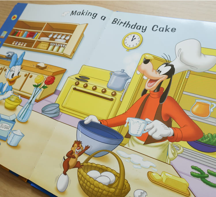 ファン・アンド・ゲームズ絵本1のP16では、グーフィーとデイジーが一緒にケーキ作りをしています。マジックペンを使ったゲームでは、グーフィーのケーキ作りのお手伝いもできますよ!♪