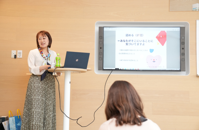 子育てコーチングインストラクターの森山さんから、「子どもの安心感を育む声かけの仕方」についてお話しいただきました。また、実際にDWEの教材を使っているお子さんの様子を事例に、どのように声掛けをしたらいいか参加者の皆さんとアイデア出しも行いました。